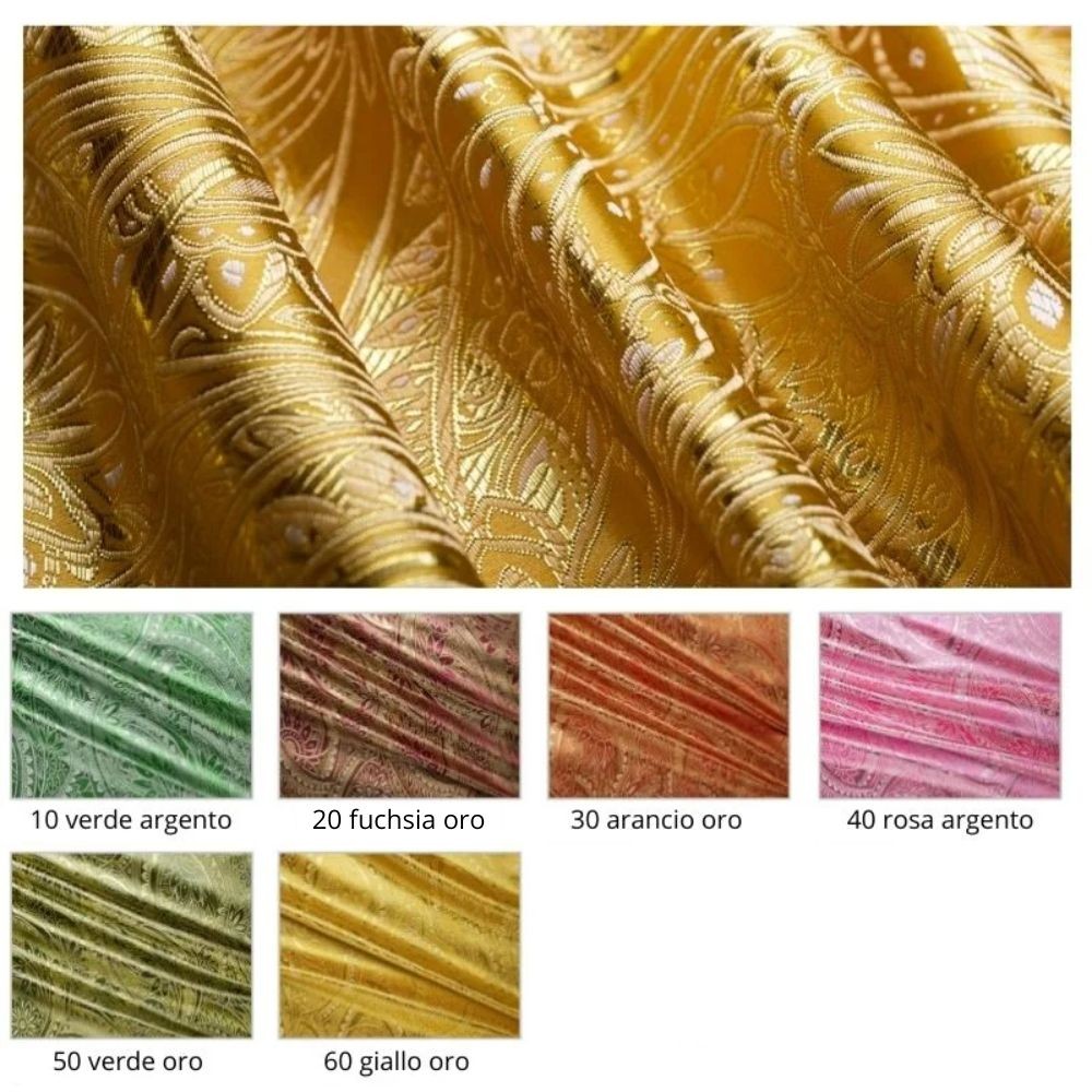 Tessuto broccato (tessuto operato con complessi disegni colorati) altezza cm 145, peso 210 grammi riferito a 100 cm x 145 cm(1 metro lineare) Composizione: 55% Poliammide 30% Poliestere 15% Metallizzato Prezzo a metro (taglio minimo d'acquisto 10 metri)