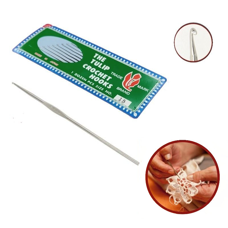 Ferri per lavorare il cotone a uncinetto, azienda Tulip Japan in materiale acciaio, le misure si riferiscono alla dimensione dell' uncino, lunghezza del ferro 15 cm con diametro variabile. Il prezzo è riferito alla confezione da 12 pezzi
