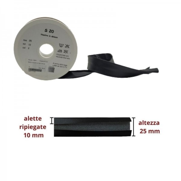 Traversino, sbieco in pelle sintetica per rifinire indumenti in pelle.Misura: altezza 2,5 cm con alette interne da 1 cm Composizione: 40% viscosa 60% poliuretano. Prezzo riferito a rotolo da 15 metri