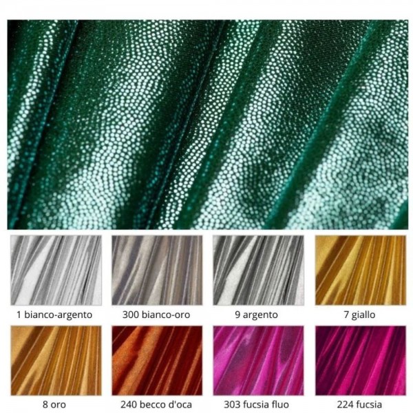Tessuto in lycra per danza e spettacolo altezza cm 150, peso 290 grammi riferito a 100 cm x 150 cm (1 metro lineare) Composizione: 80% Poliammide 20% Elastan Prezzo a metro (taglio minimo d'acquisto 10 metri)
