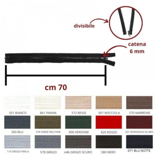 Cerniera lampo carro 70 cm catena plastica 6 mm divisibile articolo 1184/6/70