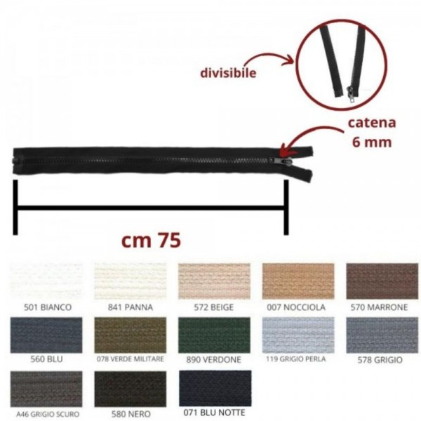 Cerniera lampo carro 75 cm catena plastica 6 mm divisibile articolo 1184/6/75