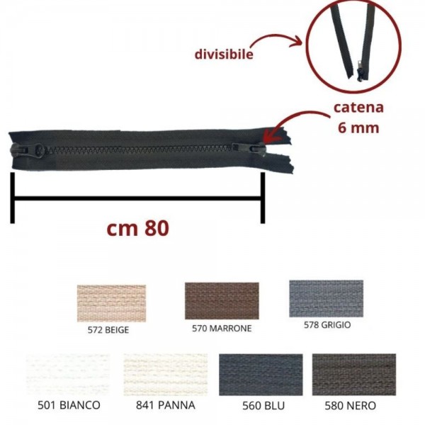Cerniera lampo combi (2 cursori) carro 80 cm catena plastica 6 mm divisibile articolo 1184/9/80